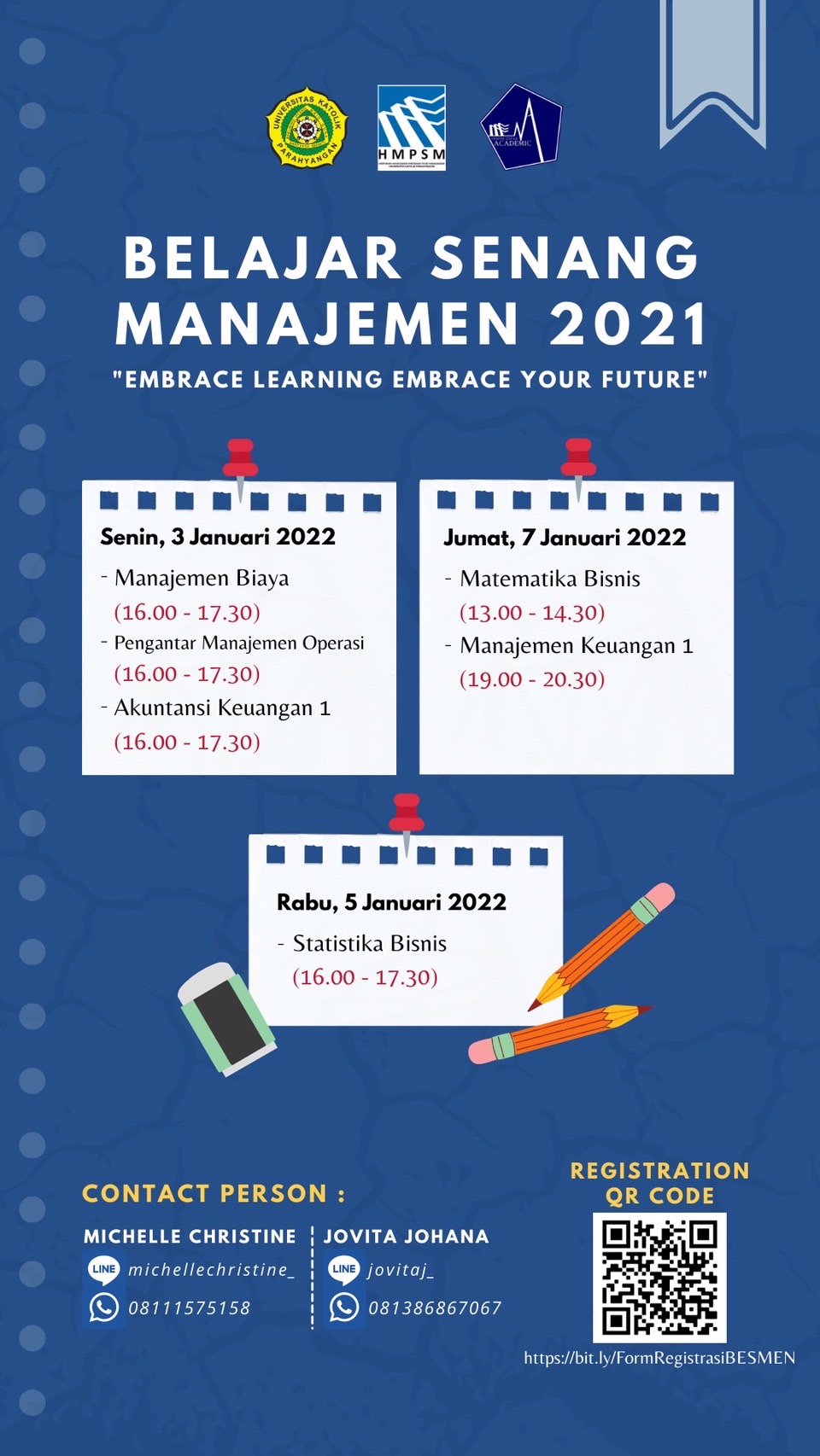 Belajar Senang Manajemen 2021 kembali hadir untuk membantu mahasiswa manajemen unpar memahami materi pada mata kuliah yang dinilai sulit dan mempersiapkan diri untuk UTS dan UAS di semester ganjil. Program kerja ini dilaksanakan 2 kali yaitu sebelum pelaksanaan UTS dan UAS. Pelaksanaan BESMEN persiapan UTS diadakan pada tanggal 25 – 30 Oktober 2021 dan persiapan UAS pada tanggal 3 – 7 Januari 2022. Pada BESMEN semester ganjil tahun 2021 terdapat 8 mata kuliah yang diadakan yakni: Manajemen Biaya, Pengantar Manajemen Operasi, Akuntansi Keuangan 1, Perpajakan 1, Perpajakan 2, Matematika Bisnis, Manajemen Keuangan 1, dan Statistika Bisnis. Mata kuliah diatas dipilih berdasarkan hasil survei sehingga sesuai dengan kebutuhan mahasiswa manajemen.