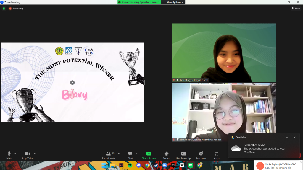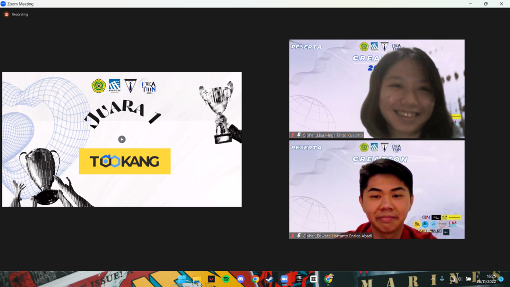 The total number of participants who took part in the Creative Entrepreneurship Competition (Creation) 2022 was 29 teams. In the mentoring session, we invited Cerry Marlencia, Agnesia Renyata, Jesyca Greslin, and Fitri Daeni who have experience in participating in business plan competitions to provide materials and become facilitators for the participants. Then, we also invited 3 judges namely Arvinda Tripradopo, S.IP, M.M. (UNPAR lecturer & director of SKYTREEDGTL), Fitri Aprilianty, S.SI., M.S.M. (SBM ITB Lecturer), and Ronald Justino, S.M. (business operations manager di glints expert class). The most potential winner was Team Mingyu with the business name “Biovy” which produces eco-friendly sanitary napkins. 3rd place was won by Sportner with the business name “Sportner” which is e-commerce with sports services. 2nd place was won by the Mesari group with the business name “Lelungan” which is a website for travel. 1st place was won by the Cipher group with the business name “Tookang” which is an application for hiring handyman to help with household needs.