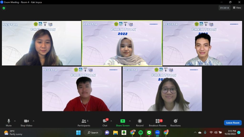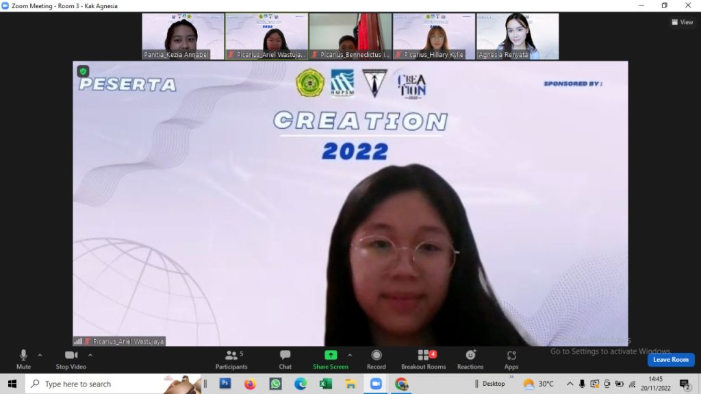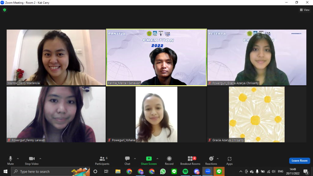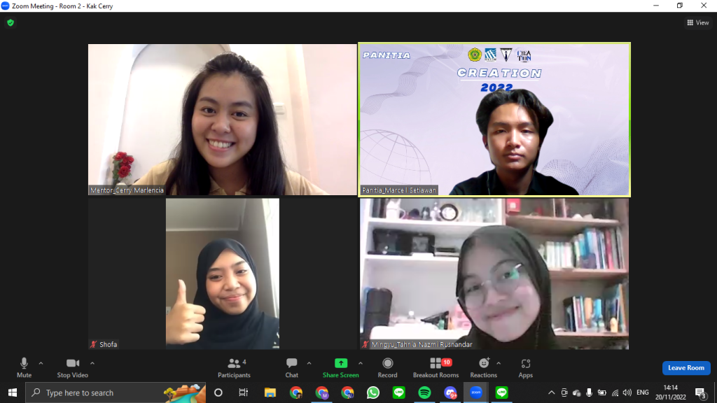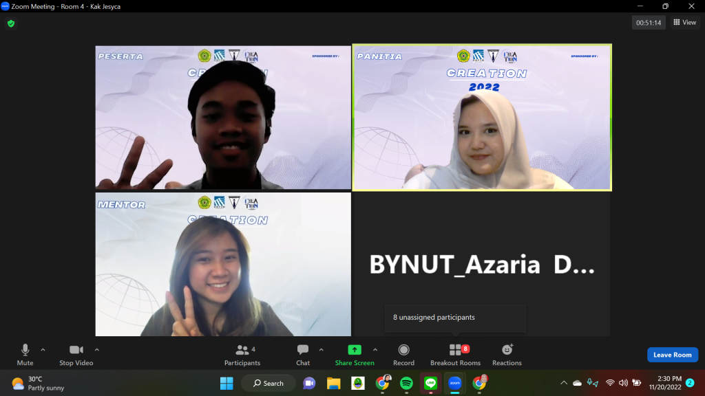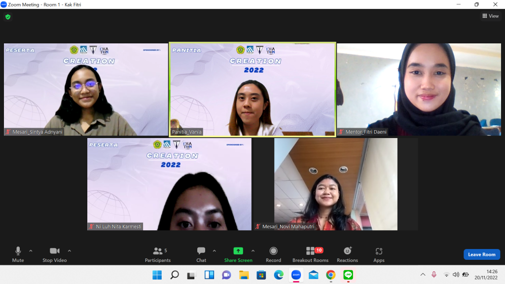 The 2022 Creative Entrepreneurship Competition (Creation) took place on November 26th, 2022, and was held online using the Zoom Meeting platform which was attended by students from various regions in Indonesia. Started with the opening of registration on 29th August 2022 to 9th October 2022 where participants submit Business Model Canvas (BMC) and Value Proposition Canvas. Then proceed to the proposal collection stage. Proposals from each participant were assessed by judges and the announcement of the 8 finalists was announced on November 12th, 2022. All selected finalists attended a technical meeting on November 19th, 2022 that explained the mentoring session and submission of business video ideas no later than November 19th. Then the technical meeting also explained the procedures for implementing pitching and awarding day on November 26th, 2022.