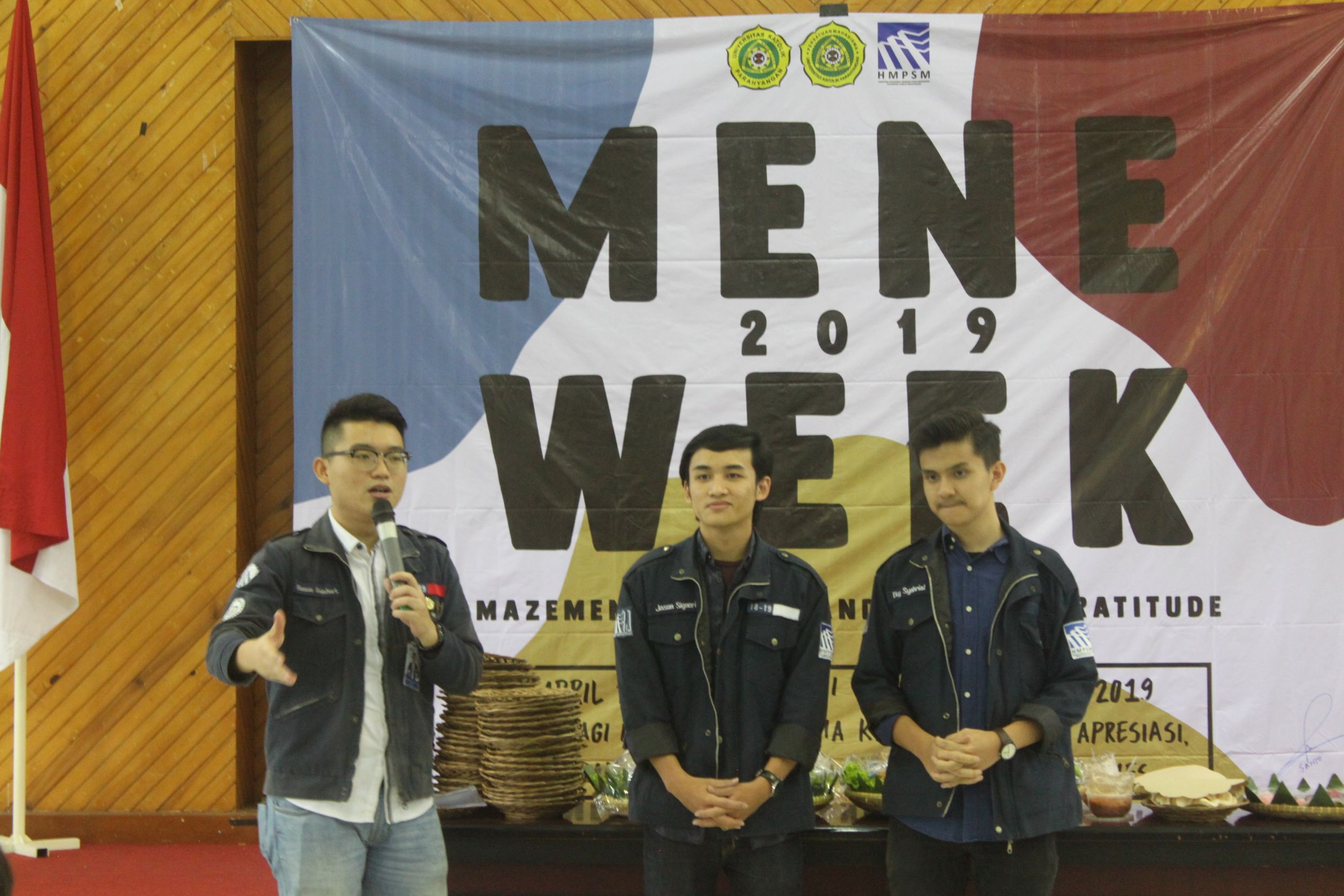 Rangkaian program kerja Meneweek 2019 dimulai pada hari Selasa, 30 April 2019 pada pukul 11.45 dengan membagi-bagikan cokelat kepada seluruh anggota HMPSM diseluruh UNPAR oleh para pengurus HMPSM. Dimulai dari student center, kemudian kantin OBC, hingga berakhir pada kantin semi basement yang biasanya menjadi tempat singgah anggota HMPSM UNPAR pada saat istirahat. Hal ini ditujukkan dalam rangka kami pengurus HMPSM ingin berterimakasih atas partisipasi dan apresiasi atas dukungan dan keikutsertaan anggota HMPSM terhadap seluruh kegiatan dan program kerja yang sudah HMSPM lakukan selama satu periode penuh. Tentunya dengan bantuan baik secara langsung maupun tidak langsung dari anggota selama satu periode ini, memberikan makna yang berarti bagi kepengurusan HMPSM.