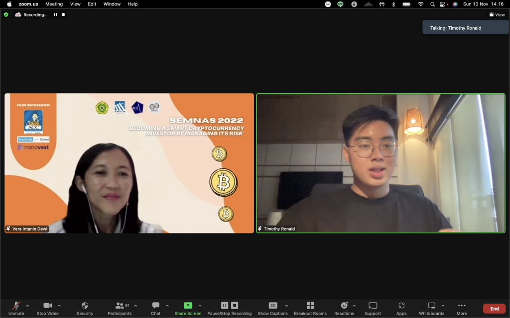 Pelaksanaan Seminar Nasional 2022 dilakukan secara online yaitu dengan menggunakan platform Zoom Meeting dan juga melalui livestream ke YouTube HMPSM UNPAR. Untuk rangkaian acara Seminar Nasional 2022 terbagi ke dalam 2 hari, yaitu hari Sabtu, 12 November 2022 dengan 2 sesi webinar, dan hari Minggu, 13 November 2022 dengan sesi mini workshop dan talkshow. Pada sesi webinar kami mengundang Ahmad Cahyo Nugroho (Lecturer at APP Jakarta Polytechnics – Ministry of Industry) dan Gema Goeyardi (CEO & Founder Astronacci International). Pada sesi mini workshop kami mengundang Muhammad Yusuf Musa (Head of Crypto Strategy Nanovest) dan selanjutnya untuk sesi talkshow kami mengundang Timothy Ronald (Co-Founder Ternak Uang & Co-Owner Bumi Borneo Basketball). Meskipun setiap sesinya memiliki bentuk acara yang berbeda, akan tetapi terdapat sesi Q&A pada akhir setiap sesi untuk memberikan kesempatan bagi peserta yang ingin mengajukan pertanyaan secara langsung kepada pembicara.