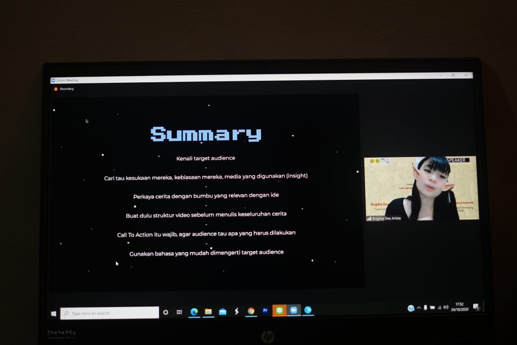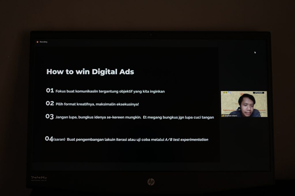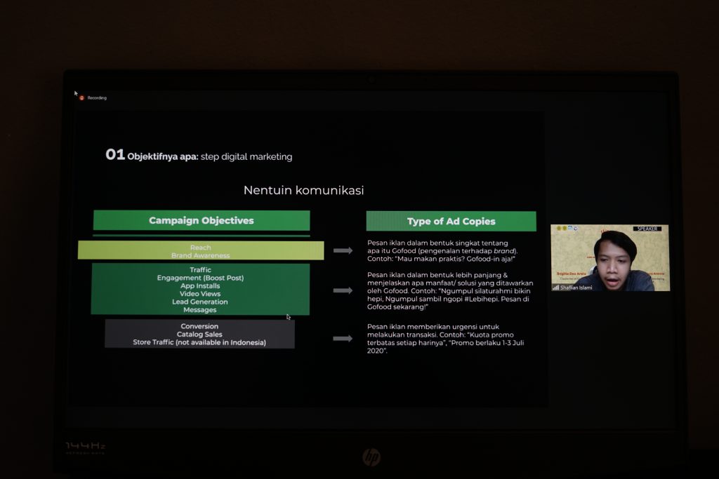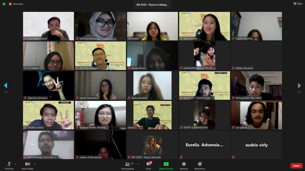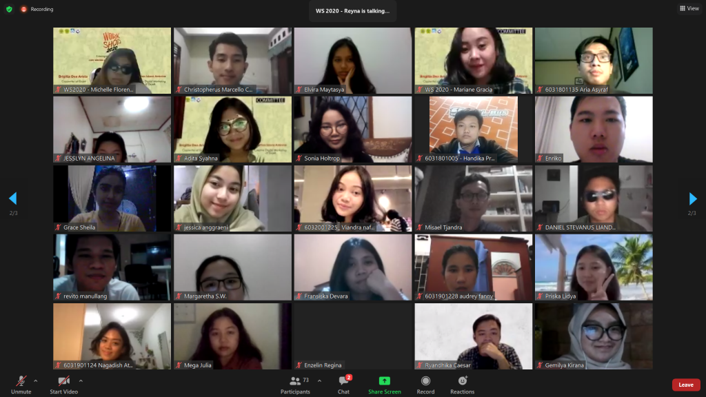 Kegiatan Workshop 2020 dibuka dengan kata sambutan oleh Wulan Apsari selaku ketua pelaksana Workshop 2020, Jason Signori selaku ketua HMPSM, dan terakhir oleh Ibu Dr. Istiharini, S.E., M.M., CMA. selaku Kaprodi Manajemen UNPAR. Setelah itu dilanjutkan dengan memperkenalkan pemateri serta memberikan secara garis besar penjelasan background daripada pemateri. Seusai penjelasan singkat oleh MC, pemateri pertama yaitu Shaflian Islami mulai memberikan materi mengenai Creative Digital Marketing dan mempersilahkan peserta yang ingin bertanya seusai materi disampaikan. Setelah 15 menit break time, antusiasme para peserta tidak pudar dan bahkan mereka semangat untuk mendengarkan dan belajar hal baru dari Dea Arista mengenai Copywriting. Sama halnya dengan Shaflian, Dea pun tak lupa untuk mempersilahkan penanya mengenai materi yang disampaikan. Tak terasa waktu sudah sampai pada pukul 19.40 WIB dan kegiatan Workshop 2020 pun sudah sampai pada penghujung acara meskipun kegiatan Workshop 2020 selesai terlambat 10 menit dari rundown acara. Semua keseruan pembelajaran, pelatihan, dan antusiasme Workshop 2020 ditutup dengan foto bersama oleh seluruh peserta, pembicara, dan panitia yang ikut dalam pelaksanaan rangkaian kegiatan Workshop 2020.
